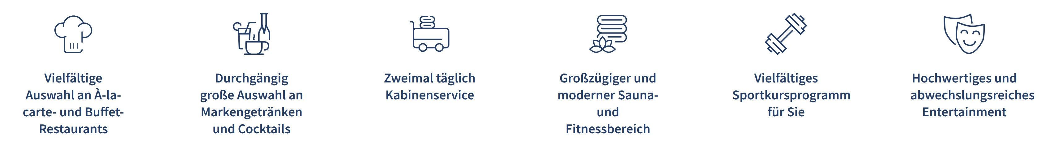 Ganz ohne Kompromisse genießen Sie auch Ihren Aufenthalt an Bord der Wohlfühlflotte. Gestalten Sie Ihre Urlaubstage genau so, wie es Ihnen gefällt, ganz ohne sich mit jemandem absprechen oder besondere Rücksicht nehmen zu müssen. Vom ersten Kaffee des Tages bis zum letzten guten Gespräch an der Bar gehört der Tag ganz alleine Ihnen. Lassen Sie sich an Bord rundum verwöhnen und nutzen Sie nach Belieben die Unterhaltungsangebote, die Sie interessieren: Freuen Sie sich auf ein außergewöhnliches Showprogramm im Theater, probieren Sie in verschiedenen Kursen Neues aus, gehen Sie auf eine kulinarische Reise oder bei den verschiedenen Sportmöglichkeiten an Ihre Grenzen - ganz gleich, wofür Sie sich entscheiden: Alles ist Teil der Mein Schiff ® Inklusivleistungen und für Sie bereits im Reisepreis enthalten.